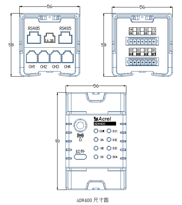DW400環保監測模塊主要用于計量低壓網絡的三相有功電能,同時可選擇四個回路的電流輸入,具有RS485通訊和470MHz無線通訊功能,方便用戶進行用電監測、集抄和管理。可靈活安裝于配電箱內,實現對不同區域和不同負荷的分項電能計量,統計和分析。