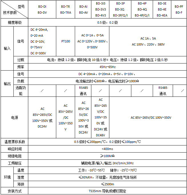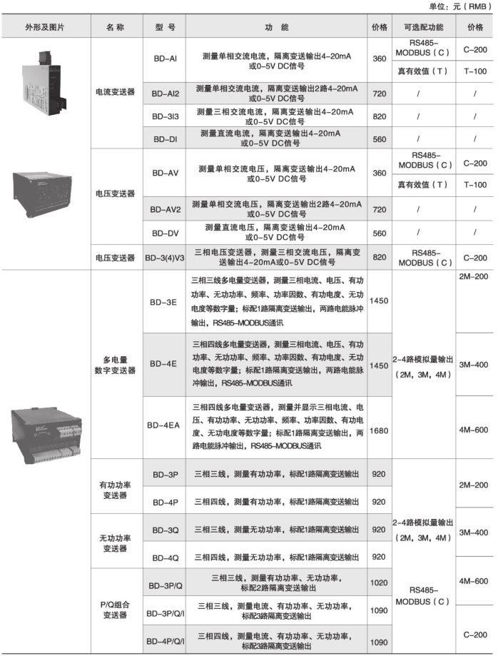 | 電壓變送器 | BD-AV | 測量單相交流電壓,隔離變送輸出4-20mA或0-5V DC信號(hào) | RS485-MODBUS |