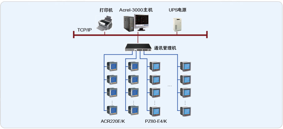 四川機械設計制造研究所主站層位于一層總值班室內,電力監(jiān)控系統(tǒng)的站控管理層設備具體包括:Acrel-2000電力監(jiān)控系統(tǒng)工控機一套、打印機、UPS。負責將通訊管理層上傳的數(shù)據解包,進行集中管理和分析,執(zhí)行相關操作、以及整個變配電系統(tǒng)的整體監(jiān)控。網絡通訊層設備的選型主要從兩個方面考慮,一個是用戶需求,功能實現(xiàn)方面;二是根據現(xiàn)場情況,綜合項目的費用來考慮的。針對這個項目來說網絡通訊層設備采用性價比高的4口帶隔離的通訊管理機。兩路進線選擇的是安科瑞生產的ACR220E/K網絡電力儀表;出線回路選擇的是安科瑞生產的PZ80-E4/K。