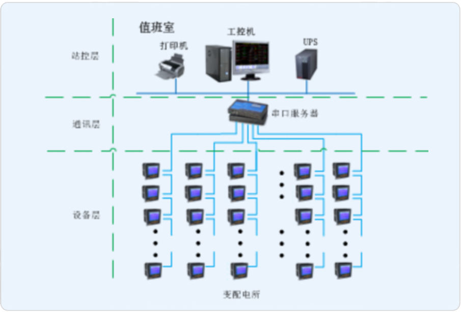 本項(xiàng)目設(shè)計為變配電所部分電力監(jiān)控系統(tǒng),變配電所位于地下一層,其中有兩路高壓進(jìn)線,配有綜合保護(hù)裝置,低壓部分,進(jìn)線柜、饋線柜配有儀表,本電力監(jiān)控系統(tǒng)監(jiān)控范圍為低壓部分裝置。通過組建系統(tǒng)網(wǎng)絡(luò),電力儀表通過現(xiàn)場總線直接接入變電所內(nèi)采集設(shè)備,并將數(shù)據(jù)上傳至Acrel-2000電力監(jiān)控系統(tǒng),實(shí)時監(jiān)測變電所內(nèi)各個回路的電流、電壓、功率、開關(guān)狀態(tài)等電參量,由此達(dá)到變電所少人值守或無人值守的智能化管理。