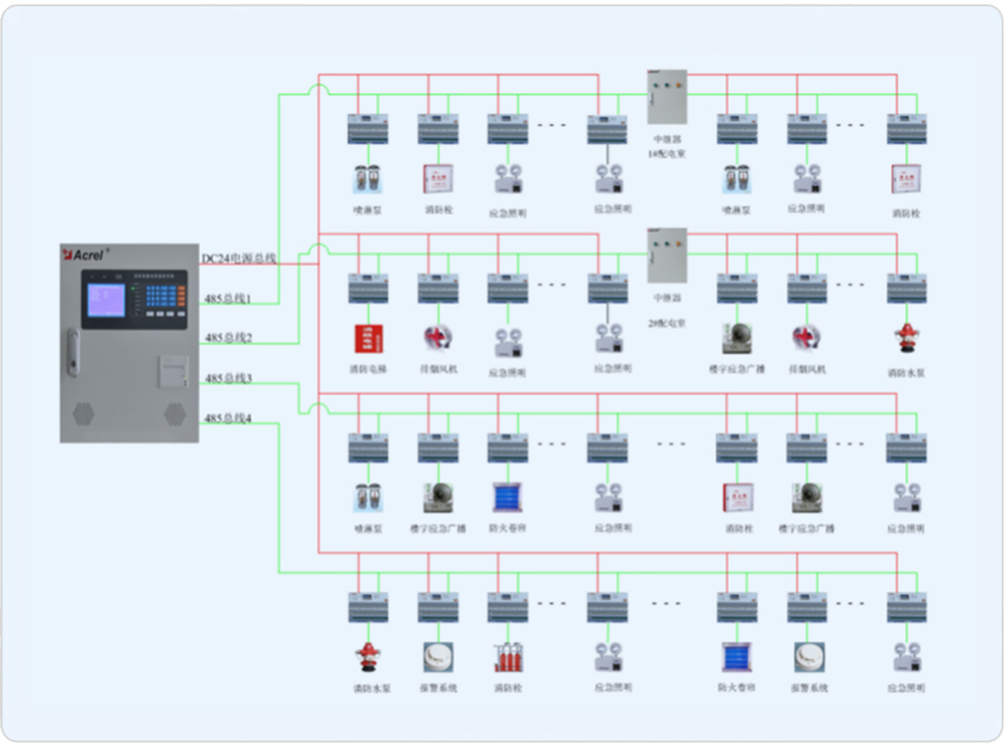 安科瑞電氣于2015年為該項(xiàng)目提供AFPM100小型消防設(shè)備電源監(jiān)控系統(tǒng)解決方案,該系統(tǒng)采用消防設(shè)備電源狀態(tài)監(jiān)控器+電壓/電流傳感器的兩層結(jié)構(gòu)組網(wǎng)模式,從而簡(jiǎn)化了系統(tǒng)結(jié)構(gòu)設(shè)計(jì)。系統(tǒng)組網(wǎng)共分為站控管理層、網(wǎng)絡(luò)通訊層、現(xiàn)場(chǎng)設(shè)備層三層,該項(xiàng)目通訊總線共接入4條通訊總線,總線在樓層配電箱手拉手串接后,接入壁掛式后臺(tái),組成消防設(shè)備電源監(jiān)控系統(tǒng)的大動(dòng)脈。